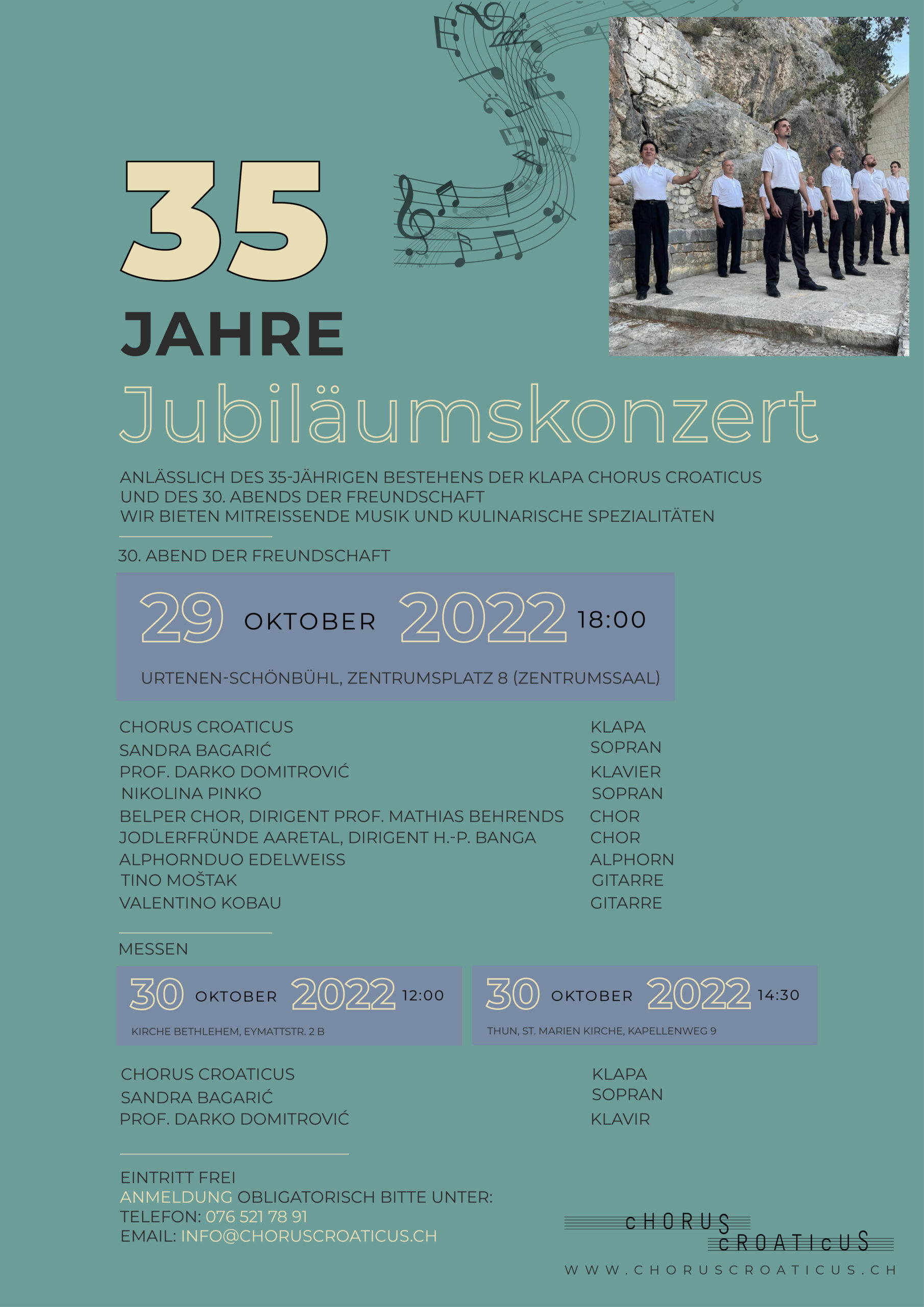 35 Jahre Jubiläumskonzert – Messe St. Marien Chorus Croaticus 30. Oktober 2022 14:30 Thun, Schweiz Katholische Kirche St. Marien, Kapellenweg 9 Karte Anlässlich des 35 jährigen bestehens der Klapa Chorus Croaticus und des 30. Abends der Freundschaft. Wir bieten mitreissende Musik und kulinarische Spezialitäten. Mitwirkende Darko Domitrović Marko Skorin Sandra Bagarić